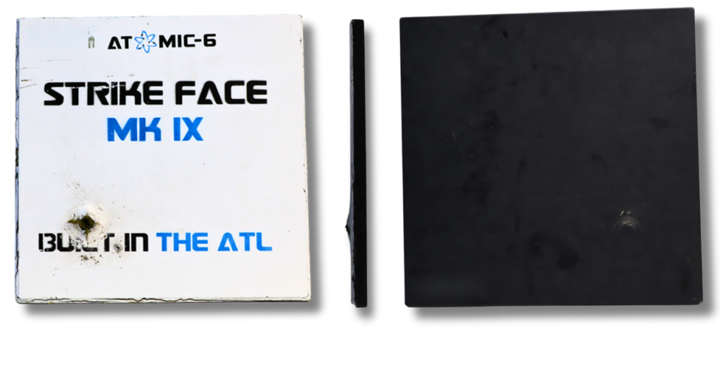 Front, side, and back views of the Space Armor™ Lite tile (30cm x 30cm x 2cm), tested with a 3mm projectile traveling at 7.2 km/s, showing minimum deformation on the back side.